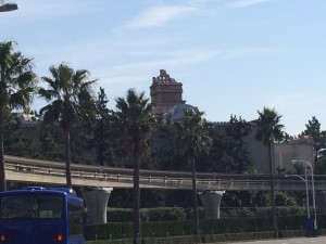 2.豪華客船、火山、廃墟ホテルが並んで見える場所。左方に東京タワー、奥に東京スカイツリーが見える。
