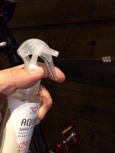 濡れた状態のフレームにガラス系コーティング剤を吹きかけます。直接当店ではコストパフォーマンスの高いエーゼットのアクアシャインコートを使用しています。